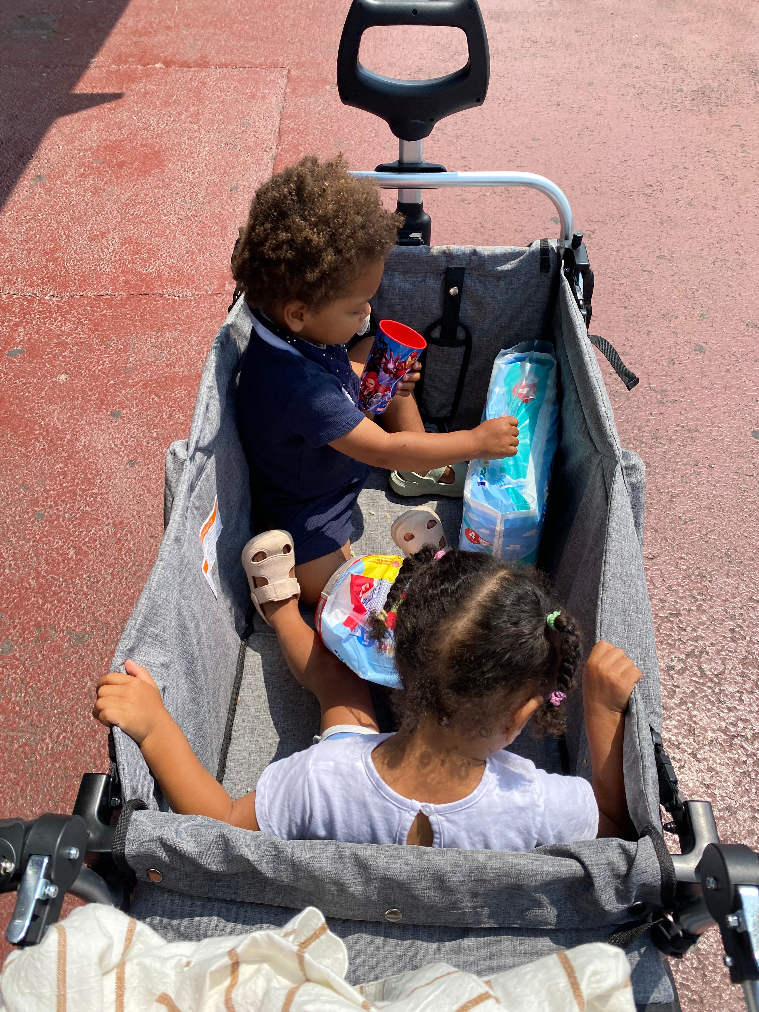 - aufgrund des tiefen gepolsterten Innenraums (gepolsterter Boden und Rückenlehne), sitzen die Kinder noch sicherer im Bollerwagen